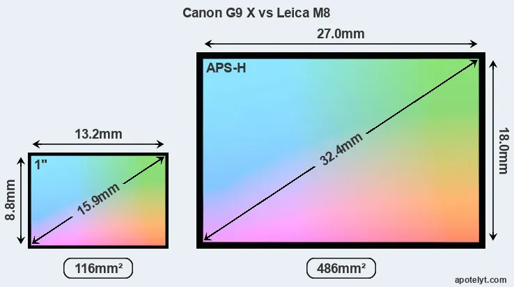 Of the two cameras under consideration, the Canon G9 X features an one-inch sensor and the Leica M8 an APS-H sensor. The sensor area in the M8 is 319 percent bigger. As a result of these sensor size differences, the cameras have a format factor of, respectively, 2.7 and 1.3. Both cameras have a native aspect ratio (sensor width to sensor height) of 3:2.