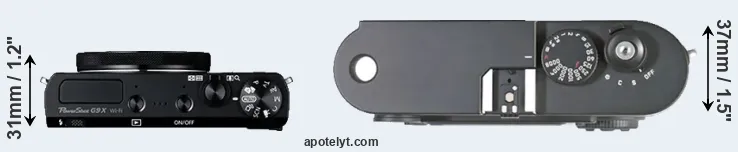 The physical size and weight of the Canon G9 X and the Leica M8 are illustrated in the side-by-side display below. The two cameras are presented according to their relative size. Three consecutive views from the front, the top, and the rear side are shown. All size dimensions are rounded to the nearest millimeter.