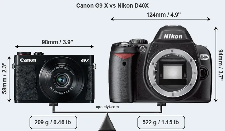 The side-by-side display below illustrates the physical size and weight of the Canon G9 X and the Nikon D40X. The two cameras are presented according to their relative size. Three consecutive views from the front, the top, and the rear side are shown. All width, height and depth dimensions are rounded to the nearest millimeter.
