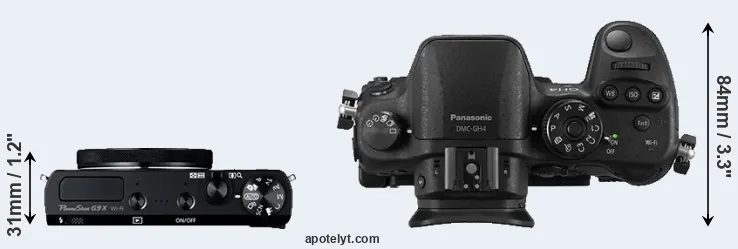 The physical size and weight of the Canon G9 X and the Panasonic GH4 are illustrated in the side-by-side display below. The two cameras are presented according to their relative size. Three consecutive views from the front, the top, and the rear side are shown. All width, height and depth measures are rounded to the nearest millimeter.
