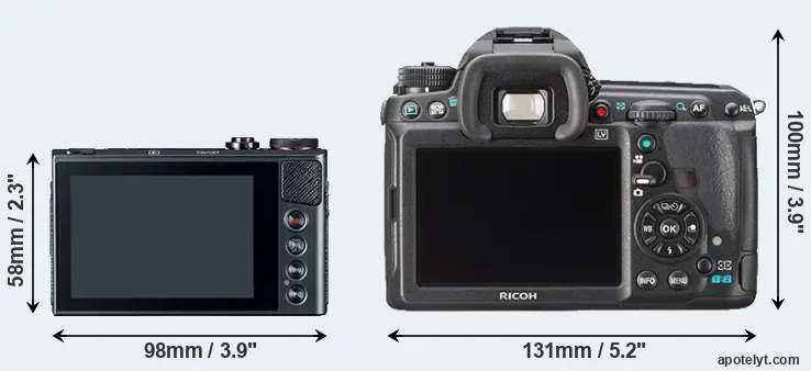 The above size and weight comparisons are to some extent incomplete and possibly misleading, as the G9X has a lens built in, whereas the K-3 is an interchangeable lens camera that requires a separate lens. Attaching the latter will add extra weight and bulk to the setup.