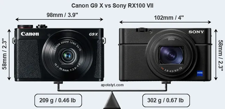 An illustration of the physical size and weight of the Canon G9 X and the Sony RX100 VII is provided in the side-by-side display below. The two cameras are presented according to their relative size. Three consecutive perspectives from the front, the top, and the back are available. All width, height and depth measures are rounded to the nearest millimeter.