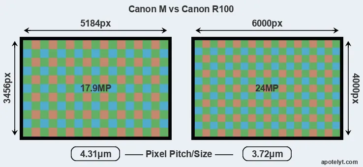While the two cameras under review share the same sensor size, the R100 offers a higher resolution of 24 megapixels, compared with 17.9 MP of the Canon M. This megapixels advantage translates into a 16 percent gain in linear resolution. On the other hand, these sensor specs imply that the R100 has a higher pixel density and a smaller size of the individual pixel (with a pixel pitch of 3.72μm versus 4.31μm for the Canon M). However, it should be noted that the R100 is much more recent (by 10 years and 10 months) than the Canon M, and its sensor will have benefitted from technological advances during this time that compensate for the smaller pixel size. Coming back to sensor resolution, it should be mentioned that the R100 has no anti-alias filter installed, so that it can capture all the detail its sensor resolves.