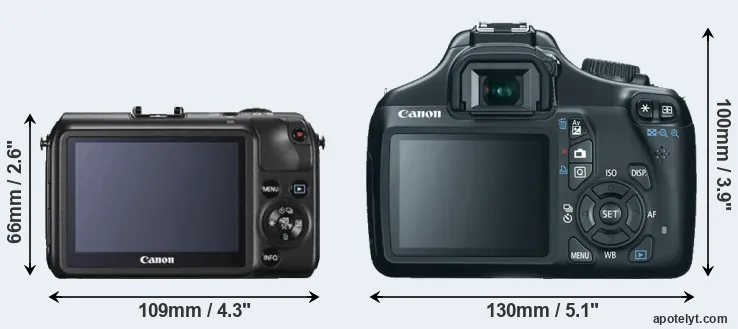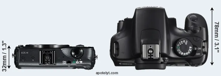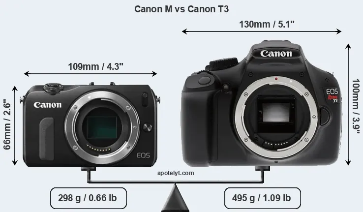 The side-by-side display below illustrates the physical size and weight of the Canon M and the Canon T3. The two cameras are presented according to their relative size. Three consecutive views from the front, the top, and the rear side are shown. All width, height and depth measures are rounded to the nearest millimeter.