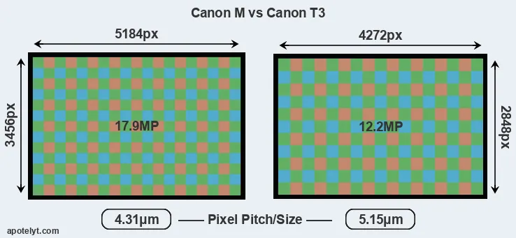With 17.9MP, the Canon M offers a higher resolution than the T3 (12.2MP), but the Canon M has smaller individual pixels (pixel pitch of 4.31μm versus 5.15μm for the T3). However, the Canon M is a somewhat more recent model (by 1 year and 5 months) than the T3, and its sensor might have benefitted from technological advances during this time that enhance the light gathering capacity of its pixels.