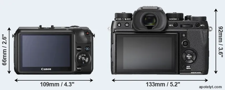 The side-by-side display below illustrates the physical size and weight of the Canon M and the Fujifilm X-T2. The two cameras are presented according to their relative size. Three consecutive perspectives from the front, the top, and the back are available. All size dimensions are rounded to the nearest millimeter.