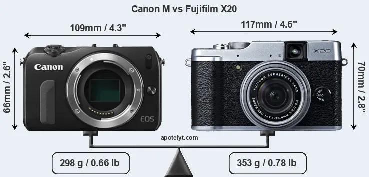 An illustration of the physical size and weight of the Canon M and the Fujifilm X20 is provided in the side-by-side display below. The two cameras are presented according to their relative size. Three consecutive views from the front, the top, and the rear side are shown. All width, height and depth measures are rounded to the nearest millimeter.