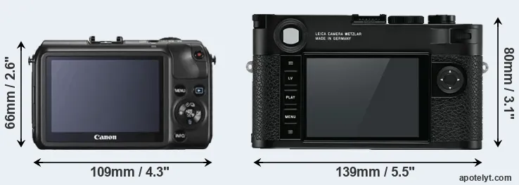 If the front view area (width x height) of the cameras is taken as an aggregate measure of their size, the Leica M10 is considerably larger (55 percent) than the Canon M. Moreover, the M10 is substantially heavier (121 percent) than the Canon M. It is noteworthy in this context that the M10 is splash and dust-proof, while the Canon M does not feature any corresponding weather-sealing.