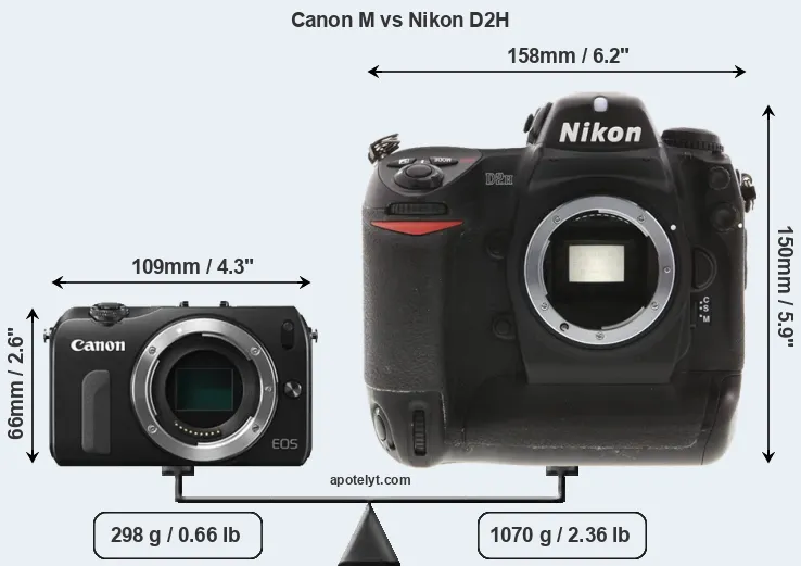 If the front view area (width x height) of the cameras is taken as an aggregate measure of their size, the Nikon D2H is considerably larger (229 percent) than the Canon M. Moreover, the D2H is substantially heavier (259 percent) than the Canon M. It is noteworthy in this context that the D2H is splash and dust-proof, while the Canon M does not feature any corresponding weather-sealing.