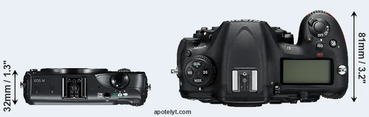 An illustration of the physical size and weight of the Canon M and the Nikon D500 is provided in the side-by-side display below. The two cameras are presented according to their relative size. Three successive views from the front, the top, and the rear are shown. All size dimensions are rounded to the nearest millimeter.