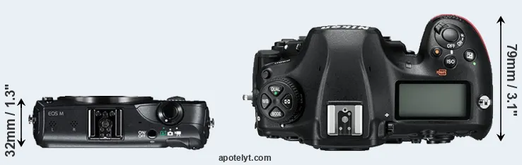 An illustration of the physical size and weight of the Canon M and the Nikon D850 is provided in the side-by-side display below. The two cameras are presented according to their relative size. Three successive views from the front, the top, and the rear are shown. All width, height and depth dimensions are rounded to the nearest millimeter.
