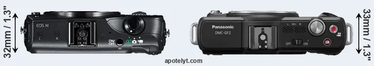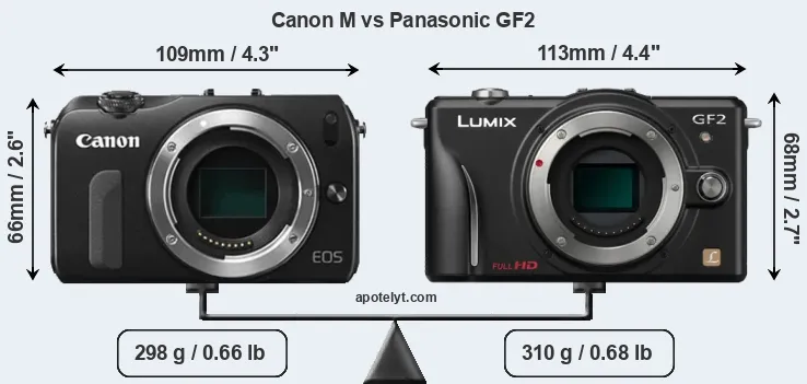 An illustration of the physical size and weight of the Canon M and the Panasonic GF2 is provided in the side-by-side display below. The two cameras are presented according to their relative size. Three consecutive views from the front, the top, and the rear side are shown. All width, height and depth measures are rounded to the nearest millimeter.