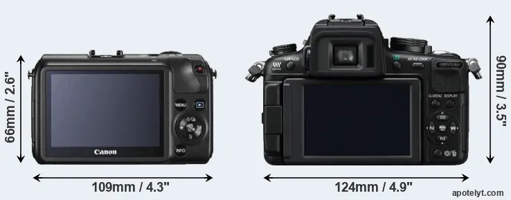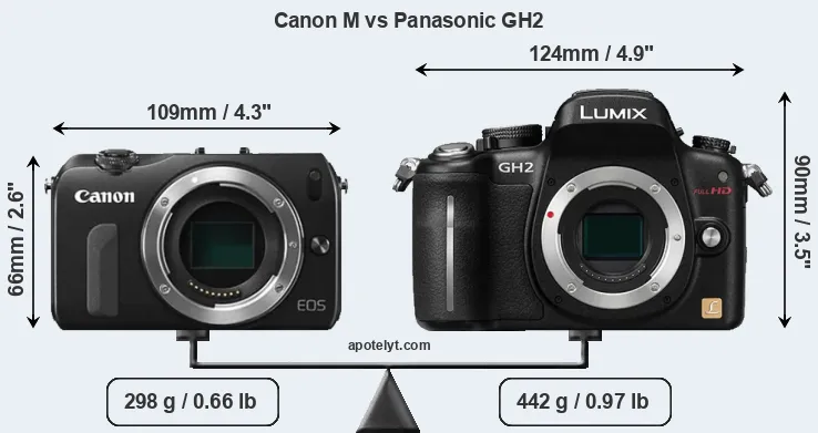 If the front view area (width x height) of the cameras is taken as an aggregate measure of their size, the Panasonic GH2 is considerably larger (55 percent) than the Canon M. Moreover, the GH2 is substantially heavier (48 percent) than the Canon M. In this context, it is worth noting that neither the Canon M nor the GH2 are weather-sealed.