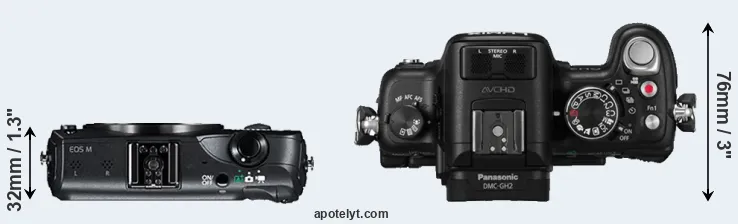 The side-by-side display below illustrates the physical size and weight of the Canon M and the Panasonic GH2. The two cameras are presented according to their relative size. Three consecutive views from the front, the top, and the rear side are shown. All width, height and depth dimensions are rounded to the nearest millimeter.