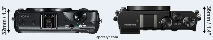 The side-by-side display below illustrates the physical size and weight of the Canon M and the Panasonic GM5. The two cameras are presented according to their relative size. Three consecutive views from the front, the top, and the rear side are shown. All width, height and depth dimensions are rounded to the nearest millimeter.