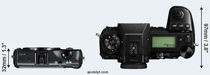 An illustration of the physical size and weight of the Canon M and the Panasonic S1 is provided in the side-by-side display below. The two cameras are presented according to their relative size. Three consecutive perspectives from the front, the top, and the back are available. All width, height and depth dimensions are rounded to the nearest millimeter.