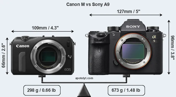 If the front view area (width x height) of the cameras is taken as an aggregate measure of their size, the Sony A9 is considerably larger (69 percent) than the Canon M. Moreover, the A9 is substantially heavier (126 percent) than the Canon M. It is noteworthy in this context that the A9 is splash and dust-proof, while the Canon M does not feature any corresponding weather-sealing.