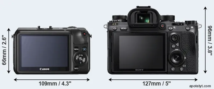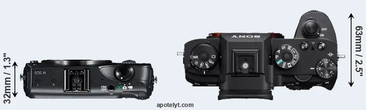 The side-by-side display below illustrates the physical size and weight of the Canon M and the Sony A9. The two cameras are presented according to their relative size. Three consecutive perspectives from the front, the top, and the back are available. All width, height and depth measures are rounded to the nearest millimeter.