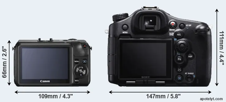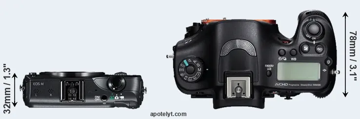 The physical size and weight of the Canon M and the Sony A99 are illustrated in the side-by-side display below. The two cameras are presented according to their relative size. Three consecutive views from the front, the top, and the rear side are shown. All size dimensions are rounded to the nearest millimeter.