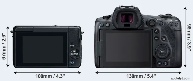An illustration of the physical size and weight of the Canon M10 and the Canon R5 is provided in the side-by-side display below. The two cameras are presented according to their relative size. Three consecutive views from the front, the top, and the rear side are shown. All size dimensions are rounded to the nearest millimeter.