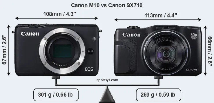 The side-by-side display below illustrates the physical size and weight of the Canon M10 and the Canon SX710. The two cameras are presented according to their relative size. Three successive views from the front, the top, and the rear are shown. All width, height and depth dimensions are rounded to the nearest millimeter.