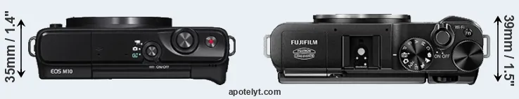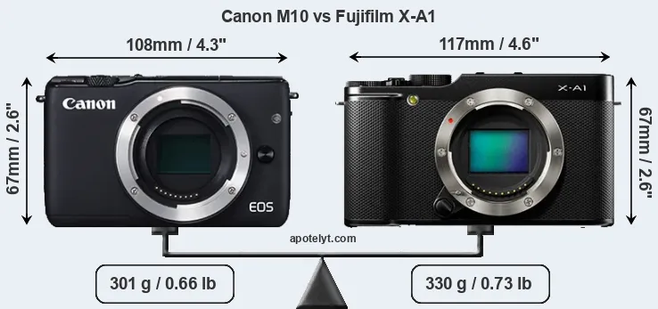 The physical size and weight of the Canon M10 and the Fujifilm X-A1 are illustrated in the side-by-side display below. The two cameras are presented according to their relative size. Three consecutive views from the front, the top, and the rear side are shown. All width, height and depth measures are rounded to the nearest millimeter.