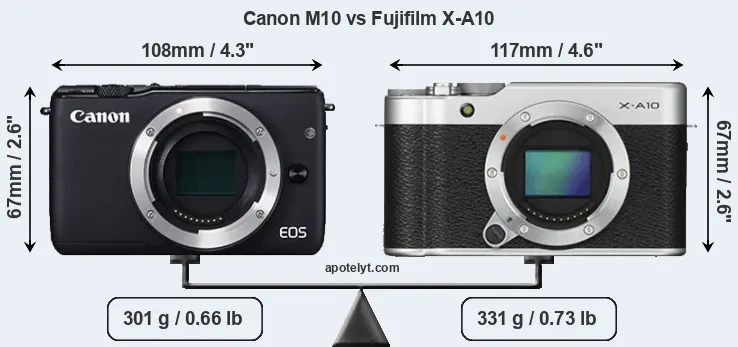 The physical size and weight of the Canon M10 and the Fujifilm X-A10 are illustrated in the side-by-side display below. The two cameras are presented according to their relative size. Three consecutive views from the front, the top, and the rear side are shown. All width, height and depth measures are rounded to the nearest millimeter.