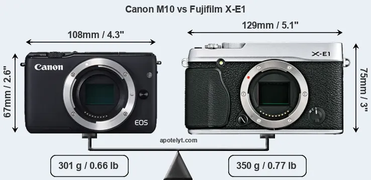 The side-by-side display below illustrates the physical size and weight of the Canon M10 and the Fujifilm X-E1. The two cameras are presented according to their relative size. Three consecutive perspectives from the front, the top, and the back are available. All width, height and depth measures are rounded to the nearest millimeter.