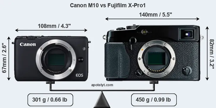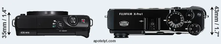 The side-by-side display below illustrates the physical size and weight of the Canon M10 and the Fujifilm X-Pro1. The two cameras are presented according to their relative size. Three successive views from the front, the top, and the rear are shown. All width, height and depth dimensions are rounded to the nearest millimeter.