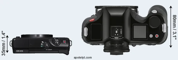 The physical size and weight of the Canon M10 and the Leica S3 are illustrated in the side-by-side display below. The two cameras are presented according to their relative size. Three successive views from the front, the top, and the rear are shown. All size dimensions are rounded to the nearest millimeter.