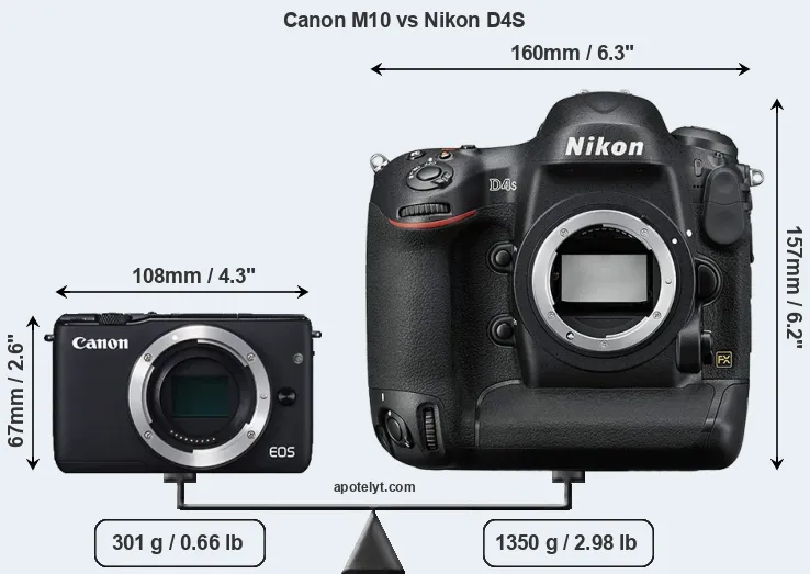 The physical size and weight of the Canon M10 and the Nikon D4S are illustrated in the side-by-side display below. The two cameras are presented according to their relative size. Three successive views from the front, the top, and the rear are shown. All size dimensions are rounded to the nearest millimeter.