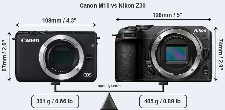 If the front view area (width x height) of the cameras is taken as an aggregate measure of their size, the Nikon Z30 is notably larger (31 percent) than the Canon M10. Moreover, the Z30 is substantially heavier (35 percent) than the M10. It is noteworthy in this context that the Z30 is splash and dust-proof, while the M10 does not feature any corresponding weather-sealing.