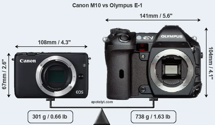 If the front view area (width x height) of the cameras is taken as an aggregate measure of their size, the Olympus E-1 is considerably larger (103 percent) than the Canon M10. Moreover, the E-1 is substantially heavier (145 percent) than the M10. It is noteworthy in this context that the E-1 is splash and dust-proof, while the M10 does not feature any corresponding weather-sealing.