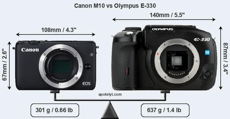 If the front view area (width x height) of the cameras is taken as an aggregate measure of their size, the Olympus E-330 is considerably larger (68 percent) than the Canon M10. Moreover, the E-330 is substantially heavier (112 percent) than the M10. In this context, it is worth noting that neither the M10 nor the E-330 are weather-sealed.