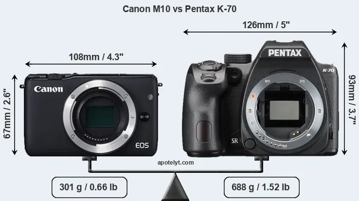 If the front view area (width x height) of the cameras is taken as an aggregate measure of their size, the Pentax K-70 is considerably larger (62 percent) than the Canon M10. Moreover, the K-70 is substantially heavier (129 percent) than the M10. It is noteworthy in this context that the K-70 is splash and dust-proof, while the M10 does not feature any corresponding weather-sealing.