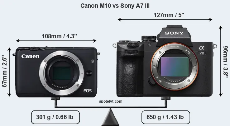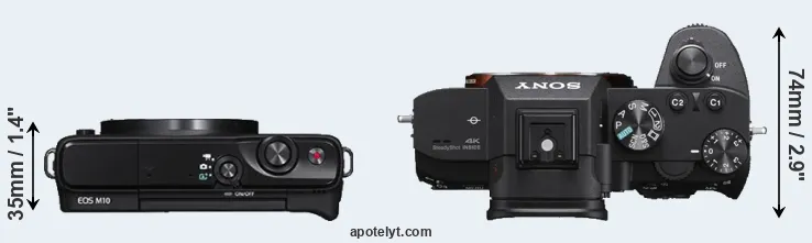 The physical size and weight of the Canon M10 and the Sony A7 III are illustrated in the side-by-side display below. The two cameras are presented according to their relative size. Three consecutive perspectives from the front, the top, and the back are available. All width, height and depth measures are rounded to the nearest millimeter.