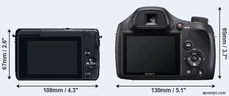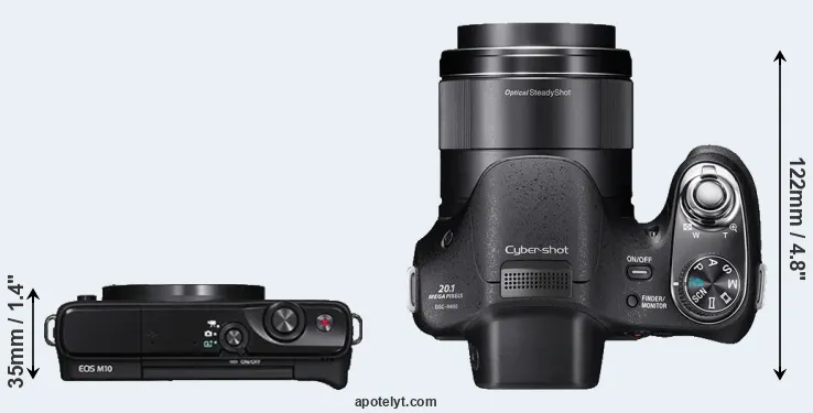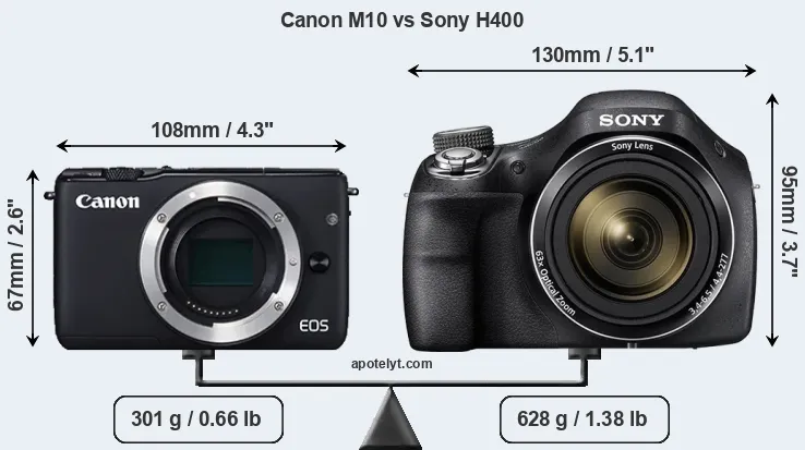 The side-by-side display below illustrates the physical size and weight of the Canon M10 and the Sony H400. The two cameras are presented according to their relative size. Three consecutive perspectives from the front, the top, and the back are available. All width, height and depth measures are rounded to the nearest millimeter.