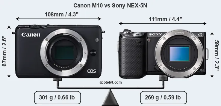 An illustration of the physical size and weight of the Canon M10 and the Sony NEX-5N is provided in the side-by-side display below. The two cameras are presented according to their relative size. Three consecutive views from the front, the top, and the rear side are shown. All width, height and depth measures are rounded to the nearest millimeter.