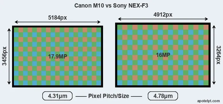 Despite having a smaller sensor, the Canon M10 offers a higher resolution of 17.9 megapixels, compared with 16 MP of the Sony NEX-F3. This megapixels advantage comes at the cost of a higher pixel density and a smaller size of the individual pixel (with a pixel pitch of 4.31μm versus 4.78μm for the NEX-F3). However, it should be noted that the M10 is much more recent (by 3 years and 4 months) than the NEX-F3, and its sensor will have benefitted from technological advances during this time that make it possible to gather light more efficiently.