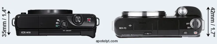 The physical size and weight of the Canon M10 and the Sony NEX-F3 are illustrated in the side-by-side display below. The two cameras are presented according to their relative size. Three consecutive views from the front, the top, and the rear side are shown. All width, height and depth measures are rounded to the nearest millimeter.