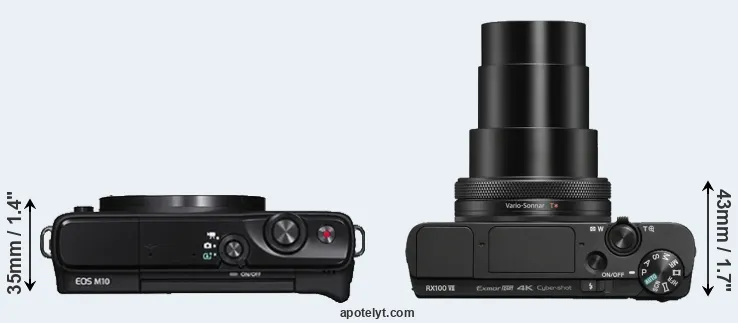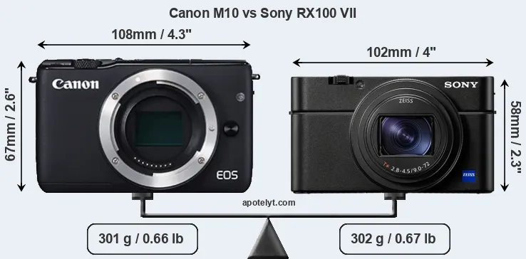 The side-by-side display below illustrates the physical size and weight of the Canon M10 and the Sony RX100 VII. The two cameras are presented according to their relative size. Three consecutive perspectives from the front, the top, and the back are available. All width, height and depth dimensions are rounded to the nearest millimeter.
