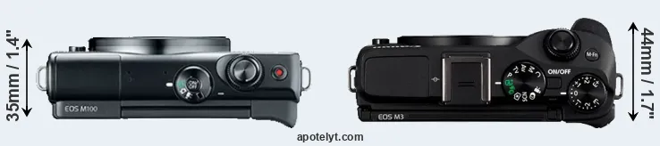 The physical size and weight of the Canon M100 and the Canon M3 are illustrated in the side-by-side display below. The two cameras are presented according to their relative size. Three successive views from the front, the top, and the rear are shown. All width, height and depth measures are rounded to the nearest millimeter.