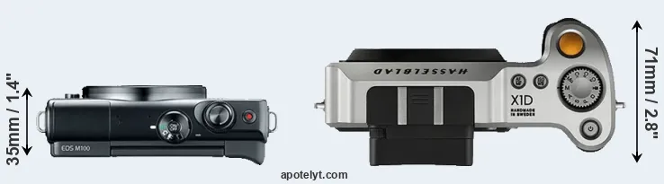 If the front view area (width x height) of the cameras is taken as an aggregate measure of their size, the Hasselblad X1D is considerably larger (103 percent) than the Canon M100. Moreover, the X1D is substantially heavier (140 percent) than the M100. It is noteworthy in this context that the X1D is splash and dust-proof, while the M100 does not feature any corresponding weather-sealing.