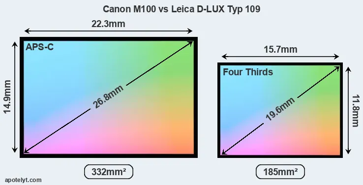 Of the two cameras under consideration, the Canon M100 features an APS-C sensor and the Leica D-LUX Typ 109 a Four Thirds sensor. The sensor area in the D-LUX Typ 109 is 44 percent smaller. As a result of these sensor size differences, the cameras have a format factor of, respectively, 1.6 and 2.0. The sensor in the M100 has a native 3:2 aspect ratio, while the one in the D-LUX Typ 109 offers a 4:3 aspect. The D-LUX Typ 109 has the particularity of featuring a switch that allows to toggle between multiple aspect ratios, while maintaining the same field of view and full image resolution.