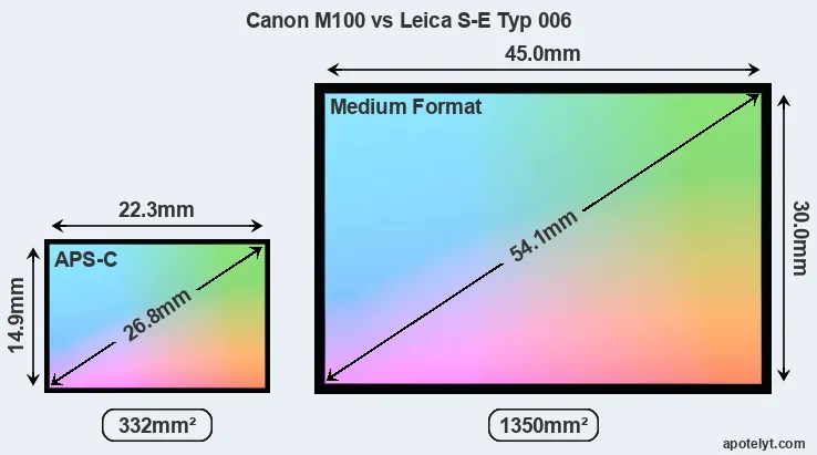 Of the two cameras under consideration, the Canon M100 features an APS-C sensor and the Leica S-E Typ 006 a medium format sensor. The sensor area in the S-E Typ 006 is 307 percent bigger. As a result of these sensor size differences, the cameras have a format factor of, respectively, 1.6 and 0.8. Both cameras have a native aspect ratio (sensor width to sensor height) of 3:2.