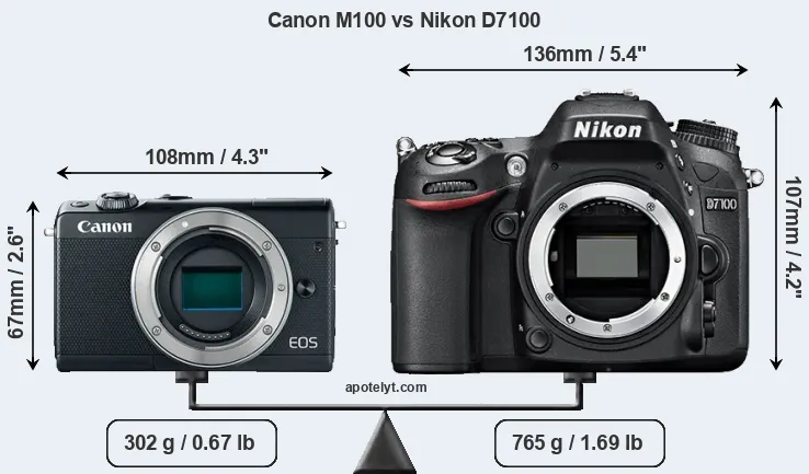 If the front view area (width x height) of the cameras is taken as an aggregate measure of their size, the Nikon D7100 is considerably larger (101 percent) than the Canon M100. Moreover, the D7100 is substantially heavier (153 percent) than the M100. It is noteworthy in this context that the D7100 is splash and dust-proof, while the M100 does not feature any corresponding weather-sealing.