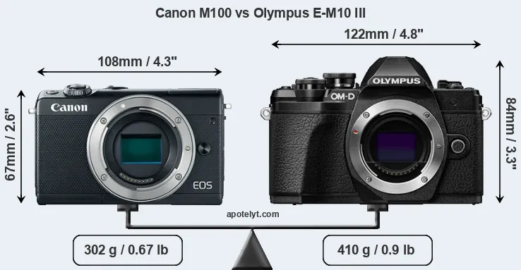 If the front view area (width x height) of the cameras is taken as an aggregate measure of their size, the Olympus E-M10 III is notably larger (42 percent) than the Canon M100. Moreover, the E-M10 III is substantially heavier (36 percent) than the M100. In this context, it is worth noting that neither the M100 nor the E-M10 III are weather-sealed.