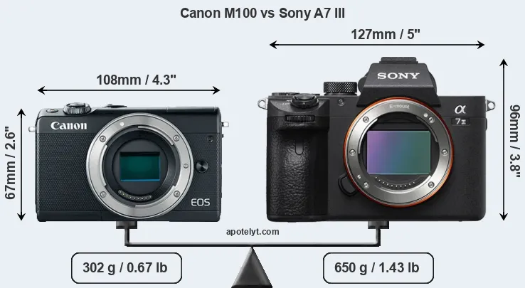 If the front view area (width x height) of the cameras is taken as an aggregate measure of their size, the Sony A7 III is considerably larger (68 percent) than the Canon M100. Moreover, the A7 III is substantially heavier (115 percent) than the M100. It is noteworthy in this context that the A7 III is splash and dust-proof, while the M100 does not feature any corresponding weather-sealing.