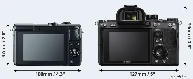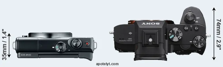 The side-by-side display below illustrates the physical size and weight of the Canon M100 and the Sony A7 III. The two cameras are presented according to their relative size. Three consecutive views from the front, the top, and the rear side are shown. All width, height and depth dimensions are rounded to the nearest millimeter.