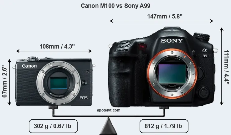 If the front view area (width x height) of the cameras is taken as an aggregate measure of their size, the Sony A99 is considerably larger (125 percent) than the Canon M100. Moreover, the A99 is substantially heavier (169 percent) than the M100. It is noteworthy in this context that the A99 is splash and dust-proof, while the M100 does not feature any corresponding weather-sealing.